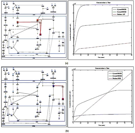 Refinement of TLR2-TLR6 and IL6 signaling pathway: (a) Mathematical model of M2 phenotype representing higher production of Anti-inflammatory factors (AIF) and SOCS1, (b) Mathematical model of M1 phenotype depicting higher production of iNOS and SOCS3 at the end of 80 min simulation.