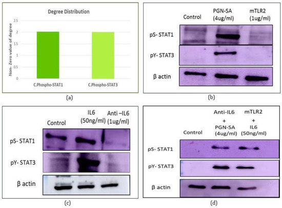 Identification of cross talks between TLR2/TLR6-IL6 signaling pathways (a) Degree distribution of cross talks identified through network analysis (b,c) Expression levels of phosphorylated STAT1 (S727) and STAT3 (Y705) during activation and inhibition of their respective pathway (d) Western blotting was used to check expression levels of phosphorylated STAT1 (S727) and STAT3 (Y705) during activation of one pathway & inhibition of another pathway, and vice versa. For all western blot experiments, an equal amount of protein was resolved and blotted for b-actin to ensure equal loading. The experiments were performed thrice. Results from one representative experiment are shown.