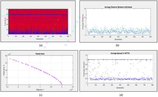 Multi objective genetic algorithm for optimization of SOCS1/SOCS3 ratio (a) Graph of elite population (b) Graph showing average distance between individuals indicating the decreased mutation rate (c) Pareto front between two objective function representing non-dominated solution (d) Graph depicting the average spread measure of the solution.