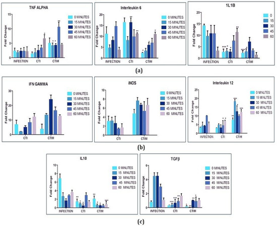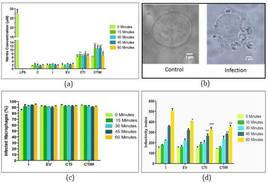 After nitrite estimation, parasite burden has been represented and estimated in various groups (Figure 9b–d). No changes in parasite burden have been observed post 30 min of infection either in transfected or non-transfected systems. During 45–60 min post infection, the fold change in iNOS and IFNγ (Figure 8b) have been increased together with high nitrite production (Figure 9a) resulting in significant decrease in parasite load in transfected system (CTI and CTIM) (Figure 9c,d).