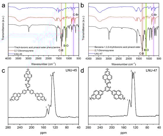 Two porous polymers (LNU-45 and LNU-47) were synthesized through the Suzuki coupling reaction using 2,7-dibromopyrene (monomer 2) as one monomer together with respective tris(4-boronic acid pinacol ester phenyl)amine (monomer 1) and benzene-1,3,5-triyltriboronic acid pinacol ester (monomer 3) as another monomer (Scheme 1a,b). The successful synthesis of the LNU frameworks was determined using Fourier transform infrared (FT-IR) and solid-state 13C-NMR spectroscopy. The C-B and B-O stretching vibrations located at ~1360 and 1140 cm−1, respectively, were obviously weakened in the IR spectra of the resulting polymers. At the same time, the C-Br stretching vibration at ~760 cm−1 for the dibromopyrene monomer disappeared from the FT-IR spectra, verifying the completeness of the Suzuki coupling reaction (Figure 1a,b) [31]. The signal peaks in the range of 120–150 ppm were attributed to the aromatic carbons in the framework, including substituted and unsubstituted aromatic carbons (Figure 1c,d). The carbon atoms of the pyrene group and phenyl carbon atoms bonded to the nitrogen center were observed at 136–140 ppm and 147 ppm, respectively, which confirmed the structural integrity of the LNU networks [32,33].