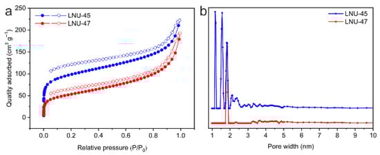 Scanning electron microscopy (SEM) images show that LNUs mainly exist in the form of irregular balls, with an average diameter of 50–100 nm (Figure S3a,b: see Supplementary Materials). As illustrated in the transmission electron microscopy (TEM) images (Figure S3c,d: see Supplementary Materials), LNUs exhibit a disordered worm-like structure, which demonstrates the porous characteristics of the materials. N2 adsorption–desorption isotherms at 77 K and 1 bar reflect the porous nature of the polymers. As shown in Figure 2a, both LNU-45 and LNU-47 have a steep gas adsorption at a relatively low pressure (P/P0 < 0.02), indicating the existence of micropores in the POP networks. The specific surface areas of LNU-45 and LNU-47 were obtained using the Brunauer–Emmett–Teller (BET) model to be 322.401 m2 g−1 and 181.924 m2 g–1, respectively. The pore size distributions of the LNUs were calculated according to non-local density functional theory (NLDFT), suggesting that LNU-45 possessed micropores at 1.165–1.809 nm and LNU-47 centered at 1.81 nm (Figure 2b). All data for LNU-45 and LNU-47 materials are listed in Table 1.