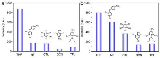 Comparison graphs of the fluorescence intensity for LNU-45 (a) and LNU-47 (b) in THF solution interacting with different pesticides.