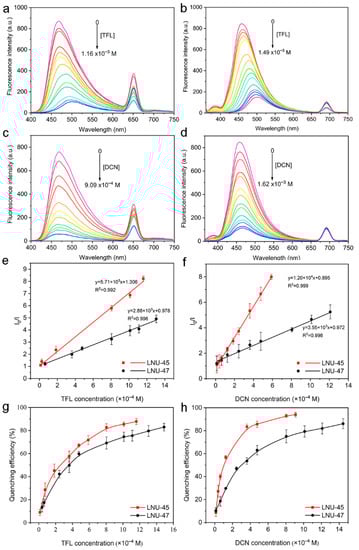 Fluorescence emission spectra of LNU-45 (a) and LNU-47 (b) in THF upon the addition of trifluralin in different amounts. Fluorescence emission spectra of LNU-45 (c) and LNU-47 (d) in THF upon the addition of dicloran in different amounts. Stern–Volmer plots of LNU-45 (e) and LNU-47 (f) quenched by trifluralin and dicloran, respectively. Quenching efficiency of LNU-45 (g) and LNU-47 (h) for pesticides with different concentrations.