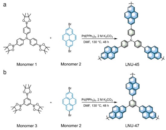 Synthetic routes of LNU-45 (a) and LNU-47 (b) via the Suzuki coupling reaction.