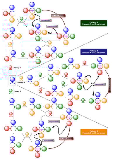 At this point, as depicted in Scheme 2, it is possible to envisage one of the most important roles of catalysis in MCRs, that is, to select one reaction pathway among all theoretical possibilities to perform the transformation. In the current example (Scheme 2), a hypothetical four-component MCR can initiate through three different reaction pathway possibilities that may be operating at the same time and affording distinct reaction species or the same intermediates. Some reaction intermediates of the same structure can be formed at different stages of the transformation, depending on the reaction pathway. Besides the probability of side reactions (not shown in Scheme 2), one should also consider the possibility of forming diastereoisomers (e.g., regioisomers, as seen in Scheme 2) and enantiomers (not shown). The presence of an appropriate catalyst, however, may aid in the reaction pathway selection, thus allowing the planning and prediction of better reaction conditions to perform the MCR, as well as stereocontrol. By using a suitable catalytic system to conduct the MCR, it is therefore theoretically possible not only to select the reaction pathway but also to control diastereo- and enantioselectivities of the transformation.