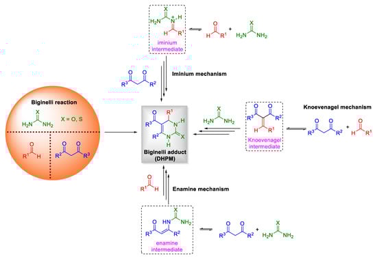 Currently accepted simplified mechanisms of Biginelli MCR, i.e., the iminium, the Knoevenagel and the enamine mechanisms. Note that their names are given after the first intermediate formed.