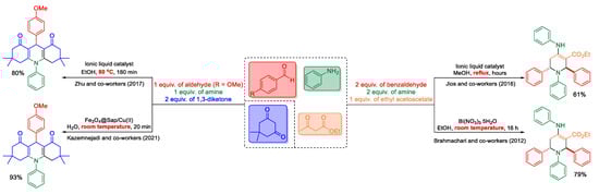 Catalyzed MCRs may be carried out under homogeneous and heterogeneous conditions. Both conditions have advantages and limitations []. Our group demonstrated [], for instance, some limitations on the recovery of the heterogeneous catalytic system for an MCR as a consequence of product precipitation. The final MCR adduct precipitated in the reaction medium and remained adsorbed in the heterogeneous catalysis, whereas in the homogeneous version, product separation was far less laborious. Some multicomponent syntheses, however, may be efficiently conducted under heterogeneous conditions with effective catalytic system recovery [,,,,,]. Metal–organic frameworks (MOFs) are, however, active, programmable and recyclable catalysts successfully applied in MCR syntheses, as recently reviewed elsewhere [,,]. This comparison reinforces the advantages of each newly developed catalytic cycle and highlights the importance of new approaches.