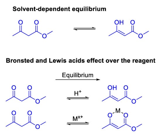 Following this work [], our group [] demonstrated the pure solvent effect on the Biginelli reaction and the valuable role of catalysis combined with a solvent. Enol restoration was experimentally demonstrated, whereas DFT calculations indicated that enol reactivity was far higher than that of its keto tautomer. By combining the proper choice of a solvent and a catalyst, actual improvements could be observed. In a recent work [], the use of palm oil with a Bronsted acid catalyst returned good results. The work developed a sustainable catalytic system using a bio-based alternative solvent and proved to be in accordance with the other two works indicating that tautomerism to the enol form was required for the reaction and the importance of both solvent and catalysis. Kamlet–Taft descriptors for some oils were determined and indicated their efficiency in encouraging enol tautomer formation. An outstanding work [] described an in silico approach to obtain calculated Kamlet–Abboud–Taft solvatochromic parameters, and the methodology was evaluated in multicomponent heterocycle synthesis, thus providing new opportunities for using green solvents associated with more efficient catalysts.