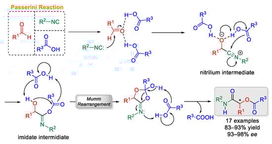 Enantioselective Passerini reaction using a chiral heterogeneous catalytic system.