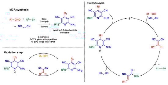 MCR synthesis and simplified mechanism for obtaining pyridine-3,5-dicarbonitrile derivatives. The reaction outcome was associated with the solvent and the base catalyst, indicating that both had a combined role in the reaction’s success.
