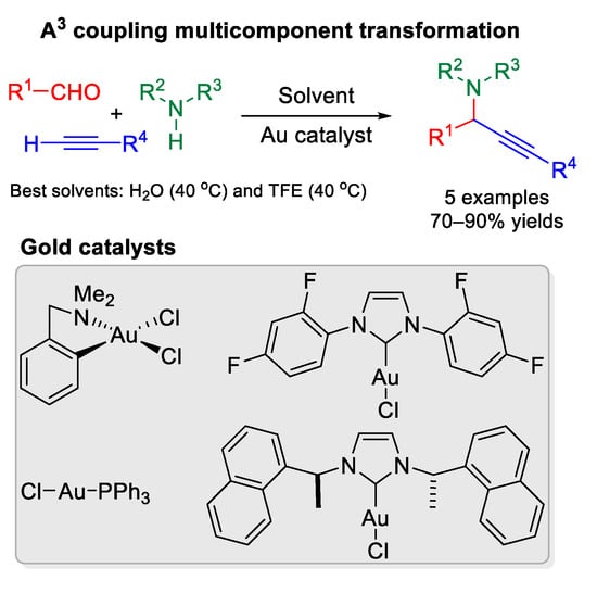 An MCR known as A3 coupling (requiring an amine, an aldehyde and an alkyne) was efficient when conducted using mostly 2,2,2-trifluoroethanol (TFE) as the solvent, and it displayed a synergic effect in gold-catalyzed reactions (Scheme 10) []. This important MCR is largely used for preparing propargyl amines from aldehydes, alkynes and amines, as reviewed elsewhere [,,]. Four gold complexes were tested as catalysts for this MCR, and different solvents required distinct temperatures to promote A3 adduct formation []. Reactions in the absence of a gold complex catalyst afforded no MCR adduct, whereas catalyzed transformations conducted in water (40 °C) proved to be as efficient as those performed in TFE (60 °C), requiring a lower temperature to produce the final MCR adduct. The beneficial solvent effects associated with the use of a gold catalyst were related to the physicochemical properties of the solvents, such as the known Reichardt solvatochromic parameters []. The authors highlighted the importance of the H-bonding network and the utilization of non-nucleophilic solvents []. These features are favorable toward iminium intermediate formation and its subsequent capture by the acetylenic gold σ-complex, i.e., a sequence of reactions favored due to the solvent effects and catalytic action of the gold complexes.