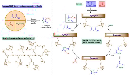 Multicomponent transformation for isoxazol-5(4H)-one (ISX) derivative synthesis catalyzed by a synzyme (synthetic enzyme) in water. The solvent and the catalyst had a synergic effect on productivity improvement. All intermediates were detected as charged species by high-resolution ESI-MS analyses, but the acidic H has been omitted for clarity.