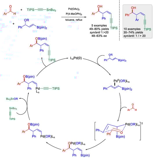 A recent example of complex multicomponent synthesis was described by Horino and co-workers []. In the reaction (Scheme 12), the authors observed high levels of (Z)-alkene stereocontrol. The catalyst proved to be essential for the MCR due to several features. Bifunctional conjunctive reagents afforded borylated π-allylpalladium species, which induced umpolung aldehyde allylation reactions in the presence of the catalyst. As expected, C-C bond formation and stereocontrol could be achieved exclusively in the presence of the palladium catalyst. The use of the palladium catalyst, as noted in Scheme 12, allowed several derivatives to be obtained. The metal catalyst exerted unique roles in two major steps of the transformation, thus indicating the efficiency of catalysis for the whole transformation, i.e., a feature that, in principle, is not possible for uncatalyzed reactions. The transition state proposed in the work indicates the origin of the stereocontrol and how the reagents are brought together by the metal catalyst during the preferential formation of the (Z) adduct (see Scheme 12).