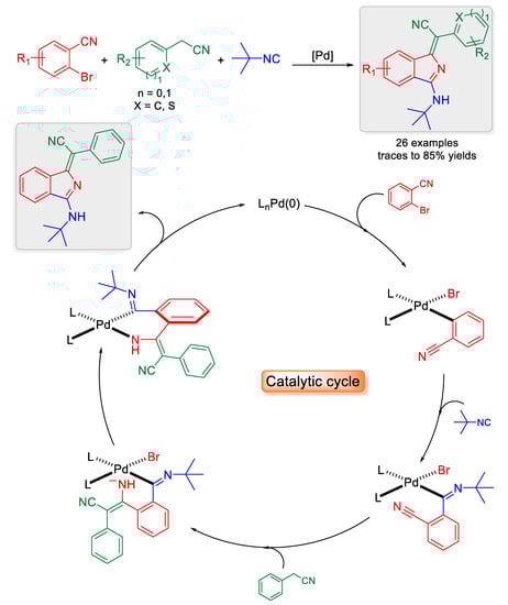 In a different example, aggregation-induced emission (AIE) fluorophores could be synthesized using a Pd-catalyzed MCR by selective C≡N triple-bond activation. Triple activation of three different triple bonds could only be achieved by using an adequate catalyst and allowed the description of one unprecedented multicomponent synthesis. The reaction selectively afforded (Z)- or (E)-1H-isoindole derivatives (Scheme 13) []. In the presence of a catalytic system, the selectivity could be driven by different reactivities of electrophilic sites. The isocyanide could be activated via an insertion reaction, and, subsequently, a nucleophilic addition reaction to the nitrile group would give the next intermediate. Consecutive reductive elimination and isomerization reactions afford the desired AIE adducts. Some of the synthesized derivatives were applied as bioimaging probes and proved to be capable of staining lipid droplets inside live cells in a selective fashion. This landmark work [] represents the power of catalyzed multicomponent synthesis and the vital catalyst effect with multiple roles to achieve the desired compounds with high stereocontrol. In this example, the efficiency of the metal catalyst is clear in some of the steps shown in the reaction mechanism (Scheme 13).