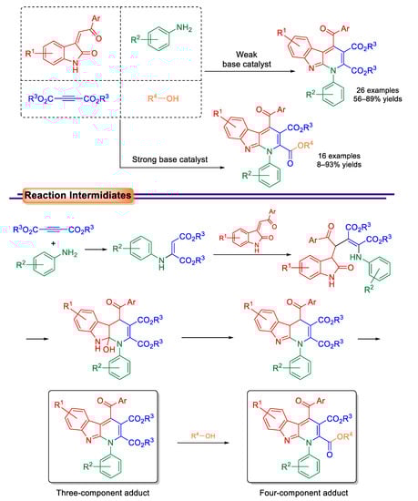 A base-catalyzed multicomponent synthesis, with high regiocontrol, was performed using a three- or four-component version, depending on the selected catalyst []. The catalyzed reaction allowed for the access of polyfunctionalized pyrido[2,3-b]indoles (Scheme 14). In the absence of a base catalyst, only traces of the MCR adduct were obtained and only in the three-component version. The use of a strong base (tBuOK in this case) turned the multicomponent transformation into a four-component version. In the four-component reaction, a final MCR adduct with controlled regioselectivity in the final transesterification reaction, a feature not observed when weaker bases were tested, was obtained in high yields. Weak bases afforded exclusively final adducts, as expected for three-component transformations. A high level of regiocontrol was achieved only using the stronger base catalyst, and a series of compounds from the four-component reaction version was synthesized. This exemplifies the importance of tuning the catalyst’s properties and how catalysis is capable of affecting the outcome of an MCR.