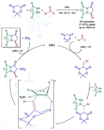 A DBU-catalyzed MCR was successfully applied in the synthesis of 1,6-diazabicyclo[4.3.0]nonane-2,7-diones with high stereocontrol []. The desired adduct was obtained with a diastereoisomeric ratio up to 95:5 favoring the cis derivative in the model reaction. The regiocontrol of the reaction was an additional feature noted in the reaction mechanism (Scheme 15). The base catalyst also helped to favor a conformation in which the substituents are far from each other, thus facilitating the stereocontrol of the reaction. The mechanism was also investigated by ESI-MS(/MS) and pointed to the accuracy of the mechanistic proposition, as well as the catalyst’s roles in the MCR.