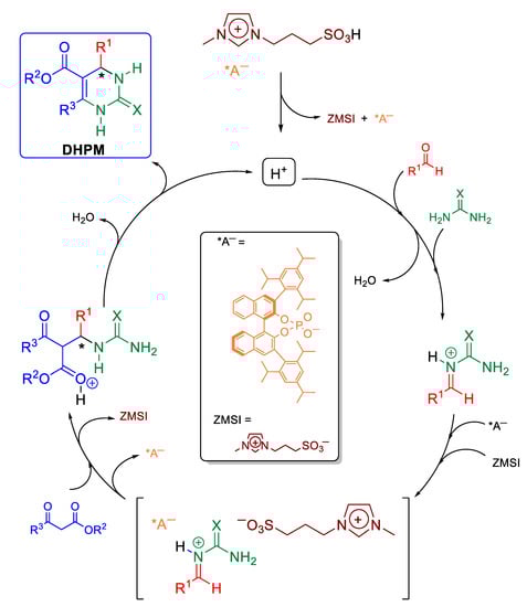 - Alvim, H.G.O.; Pinheiro, D.L.J.; Carvalho-Silva, V.H.; Fioramonte, M.; Gozzo, F.C.; da Silva, W.A.; Amarante, G.W.; Neto, B.A.D. Combined role of the asymmetric counteranion-directed catalysis (acdc) and ionic liquid effect for the enantioselective biginelli multicomponent reaction. J. Org. Chem. 2018, 83, 12143–12153. [Google Scholar] [CrossRef]