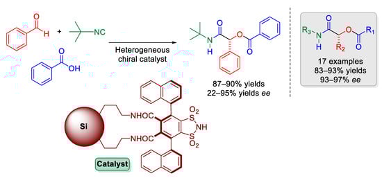 One exception for enantioselective heterogeneous-catalyzed MCRs is the recently published work of Dughera and co-workers []. In their work, a chiral benzenedisulfonimide derivative was immobilized with 3-aminopropyl functionalized silica gel, affording the heterogeneous catalyst, which was successfully applied in an enantioselective version of the Passerini reaction (Scheme 17).