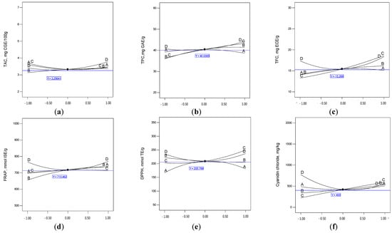 As can be seen in Table 2, the nine responses demonstrated different variations of the values of experimental data. For instance, the analyzed spectrophotometric responses, TAC, TPC, TFC, FRAP, and DPPH, ranged between 2.64 and 6.73 mg CGE/100 g, 26.96 and 53.20 mg GAE/g, 10.54 and 26.85 mg ECE/g, 505.77 and 972.43 mmol ISE/g, and 55.88 and 335.31 mmol TE/g, respectively. Except TAC, which exhibited a high extraction efficiency at run 17 (X1; 1:2 molar ratio, X2; 20% water content, X3; 40 °C, and X4; 35 min), the rest, TPC, TFC, FRAP, and DPPH, had their highest value at run 13 (X1; 1:3.5 molar ratio, X2; 30% water content, X3; 60 °C, and X4; 45 min). Meanwhile, the chromatographic analysis of individual anthocyanins had another trend. They widely ranged between 18.07 and 1554.68 mg/kg, 10.16 and 1798.48 mg/kg, 53.84 and 707.30 mg/kg, and 56.25 and 726.86 mg/kg, for cyanidin chloride, cyanidin-3-glucoside, cyanidin-3-rutinoside, and pelargonidin-3-glucoside, respectively. The best recovery of cyanidin chloride and cyanidin-3-glucoside was at run 26 (X1; 1:3.5 molar ratio, X2; 30% water content, X3; 60 °C, and X4; 5 min), cyanidin-3-rutinoside at run 10 (X1; 1:2 molar ratio, X2; 20% water content, X3; 75 °C, and X4; 35 min), and pelargonidin-3-glucoside at run 14 (X1; 1:3.5 molar ratio, X2; 30% water content, X3; 60 °C, and X4; 25 min). Apparently, except for TAC, high-temperature extraction (60–75 °C) seems to be efficient in recovering antioxidant compounds and increasing the antioxidant capacity of extracts. The molar ratio appears as a second influencing factor in a range between 2 and 3.5 of glycerol to 1 choline chloride molar ratio.
