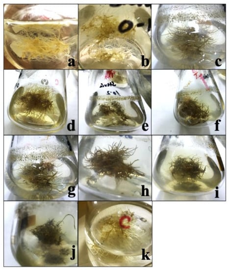 Pictorial presentation of the effect of 10 different extracts: (a) 10 mg/3 flasks, (b) 20 mg/3 flasks, (c) 30 mg/3 flasks, (d) 40 mg/3 flasks, (e) 50 mg/3 flasks, (f) 60 mg/3 flasks, (g) 70 mg/3 flasks, (h) 80 mg/3 flasks, (i) 90 mg/3 flasks, (j) 100 mg/3 flasks, and (k) control of Cuscuta reflexa on the adventitious root culture development of Stevia rebaudiana.