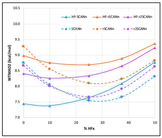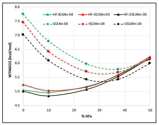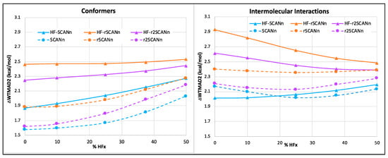 Interestingly enough, the SCANn series only surpasses the performance of HF-SCANn beyond 22% HFx, while for rSCANn and r2SCANn, this crossover happens near 5%. Significantly better performance of the self-consistent rSCANn and r2SCANn series than their HF-DFT counterparts for the intermolecular interactions and conformers is the reason behind this “early crossover” (See Table S2 in Supplementary Materials for the breakdown of total WTMAD2 into five major subcategories for all the functionals).