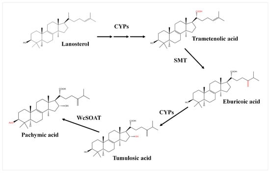 The putative biosynthetic pathway from lanostane to pachymic acid in W. cocos. CYPs: cytochrome P450 family protein; SMT: sterol C-24 methyltransferase; WcSOAT: W. cocos sterol O-acyltransferase.