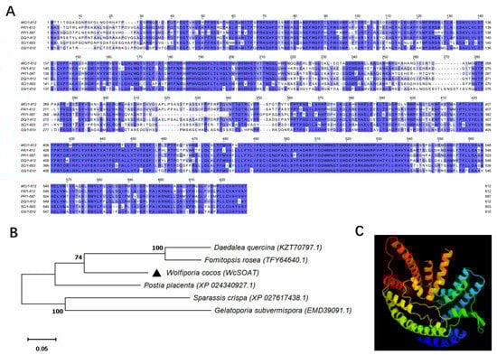 Sequence similarities between WcSOAT and its homologs. (A) Multiple sequence alignment of WcSOAT and its homologs. Full-length protein sequences were aligned using Clustal W and the alignment was edited using Jalview. Intensity of blue shading reflects the level of amino acid identity at each position. WC: W. cocos; FR: Fomitopsis rosea (TFY64640.1, 77.51%); PP: Postia placenta (XP_024340927.1, 75.25%); DQ: Daedalea quercina (KZT70797.1, 76.25%); SC: Sparassis crispa (XP_027617438.1, 65.95%); GS: Gelatoporia subvermispora (EMD39091.1, 63.92%). (B) Phylogenetic analysis of WcSOAT and its homologs from other species. The full-length protein sequences were analyzed using MEGA X with Unrooted neighbor-joining bootstrap (1000 replicates). The black triangle marks the location of WcSOAT. A scale bar at the lower left corresponds to a genetic distance of 0.05. (C) 3D structural models of WcSOAT, predicted using I-TASSER and further analyzed by PyMOL software.