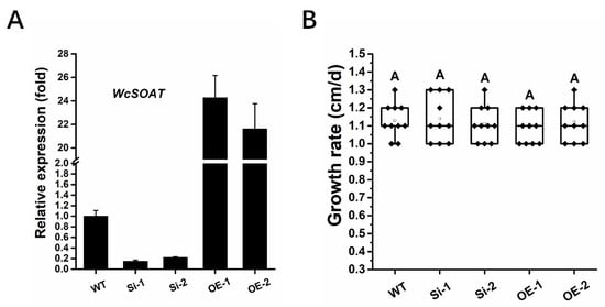 The phenotype of WcSOAT gene silence and overexpression strains. (A) The relative expression level of WcSOAT in WT, W. cocos gene silence (Si), and overexpression (OE) strains. The expression level in WT strain was set as 1, and relative transcript levels were calculated using the comparative Ct method. Transcript levels of the W. cocos his3-1 gene were used to normalize different samples. Data represent means and standard deviations of three independent replications. (B) Hyphal growth rate. The indicated strains were grown on PDA plates at 25 °C. Radial growth was measured every day for 5 days and growth rate was calculated. Data were obtained from three independent experiments with total 10 replicates. In box plots, whiskers indicate the minimum and maximum values; the line indicates the median, the box boundaries indicate the upper (25th percentile) and lower (75th percentile) quartiles, all data are plotted as black dots. Same letters in the graph indicate no statistical differences at p ≤ 0.01 using one-way ANOVA one-way.
