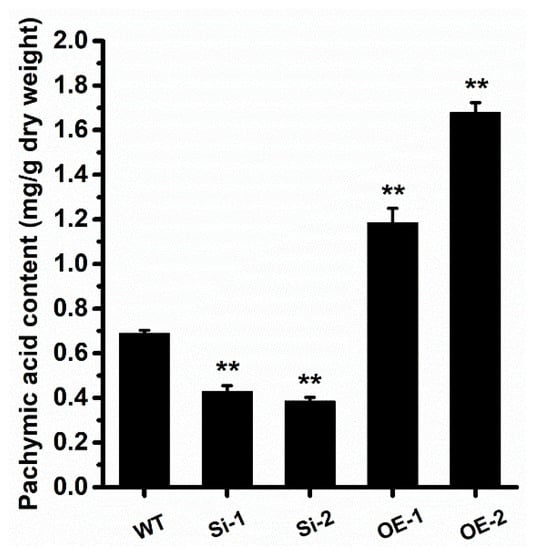 We then analyzed whether the WcSOAT gene affects the growth of W. cocos. The result showed no difference in growth on PDA in the gene silence and overexpression strains compared with the wild-type strain (Figure 4B). Then, we analyzed the concentration of pachymic acid. The results demonstrated that the production of pachymic acid decreased in WcSOAT gene silence strains, whereas the production increased in WcSOAT overexpression strains, compared with wild-type strain (Figure 5), indicating that WcSOAT is involved in pachymic acid synthesis.