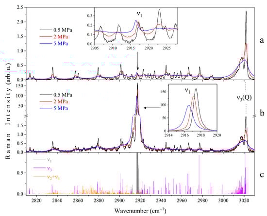 where E ω and E ω are the intensities of the experimental Raman spectra at the wavenumber ω, when the polarization planes of the scattered and exciting radiation are parallel (polarized spectrum) and perpendicular (depolarized spectrum), respectively. Here, it is necessary to take into account the overlap of the ν3 and ν2 + ν4 bands at different pressures and environments to correctly measure the integrated intensity of the ν1 band. The method of simulating the Raman spectrum as a sum of the profiles of each rotational-vibrational line was used for this purpose. A detailed description of this approach can be found in our previous work [33]. The positions and intensities of the ν3 and ν2 + ν4 lines were taken from the study of Ba et al. [52], and the pressure broadening and shift coefficients were used the same as those in [33]. According to the features of the polarizability anisotropy, only the ν3 lines were used to simulate the depolarized spectra. The ν3 and ν2 + ν4 lines were used to simulate the polarized spectra. The influence of the N2 and CO2 environments on the ν3 and ν2 + ν4 bands of CH4 was imitated by simulating the spectrum at a different pressure. The integrated intensities of the depolarized and the polarized ν1 band ( E ν 1 , E ν 1 ) were measured in the range of 2880–2950 cm−1 in each experimental spectrum after subtracting the simulated spectrum (see Figure 4).