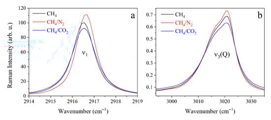 Figure 3. Experimental Raman spectra of the polarized ν1 band (a) and the depolarized ν3 band (b) of pure CH4 and CH4/N2 and CH4/CO2 mixtures at a pressure of 5 MPa. All spectra were normalized by the integrated intensity.
