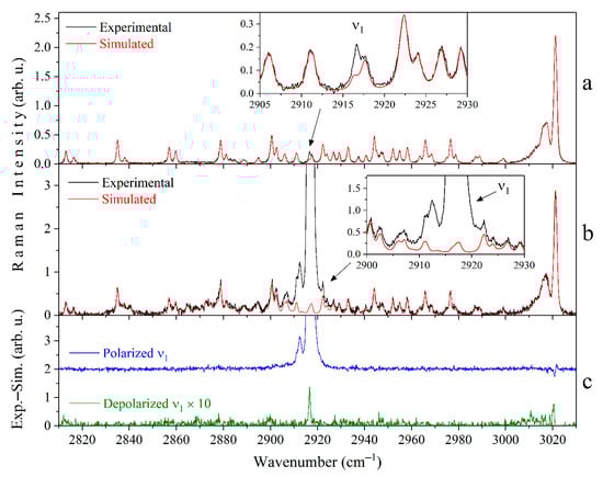 Methane (CH4) is an important greenhouse gas contained in atmospheric air. The average annual concentration of CH4 is continuously increasing due to the influence of natural and anthropogenic factors. Therefore, monitoring of atmospheric CH4 is necessary to detect leaks of greenhouse gases, as well as to improve climate prediction models. The measurement precision of concentration should be less than 100 ppb since CH4 content in atmospheric air is about 2 ppm [17]. Moreover, CH4 is included in the list of biomarkers of diseases [18,19]. The CH4 content in the exhaled air can reach 10 ppm [12]. Hence, high accuracy of CH4 measurement in a sample is necessary both for the accurate diagnosis and for the investigation of correlations. On the other hand, the region of stretching C–H vibrations (2900–3000 cm−1) is important in the air composition analysis since the most intense vibrational Raman bands of all volatile organic compounds (VOCs) are located there [20,21]. The CH4 content in the air is high compared to other VOCs. Therefore, the most intense fundamental vibrational ν1 band of CH4 (≈2917 cm−1) makes a significant contribution to the spectrum of these gaseous media in the indicated spectral range. It should be noted that pressure and different molecular environment significantly affect the spectroscopic characteristics of the ν1 peak of CH4 [22,23,24,25,26,27,28,29,30]. The higher the molar fraction of the perturbing component, the stronger its influence on the spectrum. The effect of the main components of air cannot be neglected since their concentration is orders of magnitude higher than CH4. Thus, it is necessary to account for these changes in the CH4 spectrum to decrease the LOD of CH4 and correctly derive the concentrations of other organic compounds from the Raman spectra of air. A simulation method of the CH4 spectrum is one of the most promising approaches for this purpose [26,31,32,33]. The required intensities and positions of spectral lines can be obtained using calculations based on the tensor formalism and the group theory methods [34]. However, it is necessary to know the tensor components of the total polarizability derivative of the molecule. The depolarization ratio (ρ) can be expressed in terms of these quantities [35,36,37]. Since the spectral sensitivity of a spectrometer is not the same for radiation in different polarization states, the use of the exact experimental value of the ρ can both increase the reliability of theoretical calculations and more accurately fit the simulated spectra to the experimental ones.