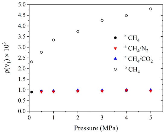where E ν 3 and E ν 3 are the integrated intensities of the Q branch of the ν3 band in the depolarized and polarized spectra, respectively. These intensities were measured in the range of 3000–3030 cm−1. The data obtained are presented in Figure 5. The values of the ρ1) are in the range of 0.0009–0.001 and the influence of the molecular environment in the pressure range of 0–5 MPa is not observed. The double standard deviation of all measurements is less than 0.0001. It should be noted that much larger values of the ρ1) at 5 MPa were obtained by other authors [40,41,42]. We suppose that this discrepancy is caused by the neglect or incorrect accounting of the overlap of the ν1 peak by the ν3 and ν2 + ν4 bands, in addition to the low signal-to-noise ratio. The obtained values of the ρ1) of pure CH4, where the subtraction procedure of the simulated spectra was not performed, are also shown in Figure 5 for comparison. It can be seen that the pressure dependence of the ρ1) is observed in this case, which corresponds to the previous results [42]. The reason for this is that the contribution of the ν3 and ν2 + ν4 lines to the intensity of the ν1 band (in the 2910–2925 cm−1 range) increases due to the collisional broadening effect. Thus, the data in Figure 5 confirm that the contribution of depolarized lines must be taken into account to obtain the most reliable values of the ρ.