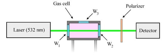 According to Figure 5, the measured value of the ρ1) is not equal to zero even at a pressure of 0.1 MPa, which does not agree with theoretical calculations [35,53,54]. Let us estimate the error of our measurements. The main sources of the measurement error are imperfect polarization of the laser radiation, different transmittance of the polarizer in orthogonal orientations, and polarization scrambling by the windows of the gas cell [55,56], as well as the non-zero collection angle for the scattered radiation [38,57,58,59]. The additional experiment was carried out to evaluate the influence of the first three effects. Laser radiation was directed through the cell windows and the polarizer and was guided to the photodetector at the output (see Figure 6). At the first stage, the cell was pressurized by pure CH4 at 0.1 MPa and the power of the transmitted radiation was measured in two orthogonal polarization orientations. At the second stage, the pressure of CH4 in the cell was increased to 5 MPa and similar measurements were performed. It was found that the ratio P / P was more than 1000 in both cases, where P and P are the measured radiation power with perpendicular and parallel orientation of the polarization plane to the polarization plane of the exciting radiation, respectively. It should be noted that the entrance window (W1) and the exit window (W2) influenced the results obtained in this experiment, but the window W1 and the side window (W3) influenced the measurements of the ρ1). Since all the cell windows are identical, we can conclude that the systematic measurement error of the ρ1) is less than 0.001 at a zero-collection angle, taking into account the aforementioned effects of polarization scrambling.