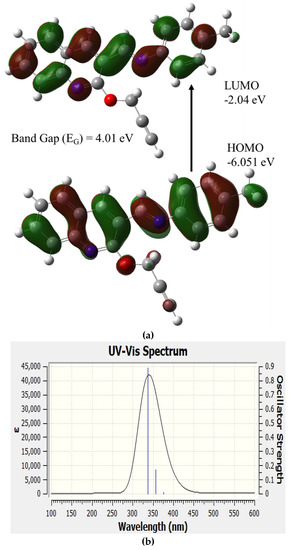 The molecular orbital structure of 5d is shown in Figure 4a, and electron distributions of HOMO are homogenously localized vertically in the ring structures. However, the LUMO was split into two, with major MOs present on top of the molecular structure. The HOMO and LUMO were present at −6.051 eV and −2.04 eV, with an energy gap of 4.01 eV. The HOMO and LUMO gap had contributions from three singlet oscillations, namely S0–S1, S0–S2, and S0–S3 vibrational bands at 3.2952 eV (376.26 nm), 3.4785 eV (356.43 nm), and 3.6723 eV (337.62 nm) with an oscillator strength of 0.0121, 0.1700 and 0.8922, respectively. This shows that the unique optical properties of imine compounds arise from a large bandgap. This also shows they are fluorescent molecules with singlet oscillation, and have no charge trapping triplet states. The total energy of compound 5c was −955.98 kJ mol−1. The total dipole moment was 0.1228 e·nm, indicating it is a low to moderately polar molecule. Therefore, it could easily dissolve in non-polar solvents, such as tetrahydrofuran, toluene, and chloroform.