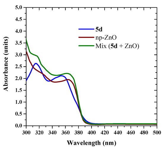 Compound 5d had the best quantum yield of all synthesized compounds, the calculated Q.Y. of 5d was 0.3, and the Stokes was 60 nm, as shown in Table 1. Therefore, the compound 5d has the best chance of producing a random laser. Hence, a random laser was designed using ZnO nanoparticles of an average size of 90 nm. The shape of synthesized ZnO resembled flakes. The ZnO of concentration 5 mg/mL was dispersed into toluene, to form solution 1 (Solution 1). The concentration of compound 5 was dispersed in 1 mg/mL of the same solvent to form solution 2 (Solution 2). The mixture solution was formed by adding both solutions (Solution 1 and Solution 2) in a 1:1 v/v ratio. Due to the presence of the acceptor sites in compound 5d, it attached to the ZnO nanoparticle. Figure 6 shows the absorption spectra of the mix solution in comparison with pure ZnO nanoparticles and pure compound 5d in toluene, for above said concentrations. The absorption spectra showed an excellent match between ZnO and compound 5d absorption spectra, and the mixing improved the absorption slightly. The fluorescence of ZnO nanoparticles was weak, which is associated with the defecting state fluorescence of ZnO [29].