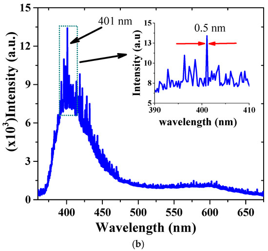 When the pump energy was raised above the threshold (17 mJ), the sharp peaks started to appear, as shown in Figure 7a (blue line). With the further increase in pump energy (20 mJ) the sharp peaks grew, as shown in Figure 7b. The inset of Figure 7b shows the spikes were very sharp, and the full width at half the maximum was 0.5 nm. Since the optical gain was random, the peak emission wavelength changed. It is important to note compound 5d did not lase without ZnO, but any nanoparticle such as SiO2, TiO2 or Al2O3 can also be used as a core to produce the random loop optical gain. The nanosized and random aggregation and arrangement of the particles enabled a random gain due to the random scattering on the surface of the nanoparticle, meaning the loop may have involved one, or many, nanoparticles. Nevertheless, this random laser from the novel compound 5d could be useful in the design of tunable laser with low cost. If the same mixture is embedded into a polymer matrix, it could be good candidate for a solid-state tunable laser.