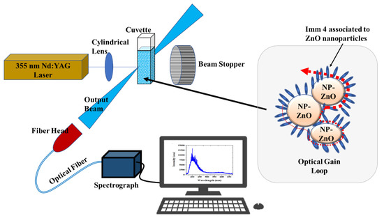 The synthesis of (E)-4-methyl-N-((2-(prop-2-yn-1-yloxy)quinolin-3-yl)methylene)aniline from propagated quinoline carbaldehyde, 3, had a molecular weight (Mw) of 300.361 g mol−1. The ZnO nanoparticles were synthesized using an opti-sense nanoparticle synthesizer through the hydrothermal method, as reported before [30]. Its average size distribution was 100 nm, with particle size ranging from 30–180 nm. A Perkin–Elmer Lambda 950 spectrophotometer (Llantrisant, United Kingdom) was used to record the absorption spectra of the film samples in the range of 100 to 1100 nm. The fluorescence spectra at the excitation wavelength of 300–360 nm (depending on excitation peak) from a xenon flash lamp was measured using a spectrofluorometer (LS 55, from the same company). The laser experimental set-up and formation of the ZnO- 5d random optical gain loop is depicted in Figure 8 (modified version of ref. [31,32]). To achieve transverse pumping, the third harmonic (355 nm) of a 5 ns Nd:YAG laser was focused by a quartz cylindrical lens (5 cm focal length). The cylindrical lens focused the pulse onto a horizontal strip of 1 cm × 2 mm (length × width). The dimension of the Cuvette was 1 × 1 × 4 cm (L × B × H), and it was filled with a solution mixture of A and B, where A was 2 mg/mL of ZnO in Toluene and B was 1 mg/mL of 5d in toluene. The output light was fed to optic fiber connected to a spectrometer (Ocean Optics Range 300–1200 nm, resolution ≤0.5 nm). The output data was acquired and recorded on a PC. A beam stopper was placed behind the Cuvette to stop residual light from the pump laser. All simulations were accomplished with Avogadro, Marvin Sketch, and Gaussian 16 program package [33] at King Saud University using a workstation equipped with AMD Ryzen 9 3950X 16-core, 32-Thread, 128 GB RAM, 1 TB M.2 SSD, with an FORTRAN emulator. The B3LYP method with basis set 6–31G* was used for all time-dependent DFT (TDDFT) and density functional theory (DFT) calculation of imino quinolines [34,35].