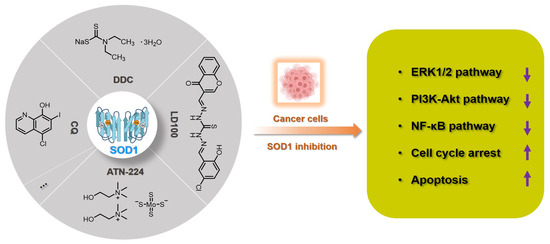 Recently, emerging evidence from researchers has indicated that SOD1 is usually overexpressed in cancer cells; its activity is essential to maintain higher ROS levels under the critical threshold during aberrant energy metabolism of cancer progression [41]. For example, SOD1 accumulations were observed not only in the cytoplasm but also in the nucleus of human primary breast and mammary cancers [46]. Besides this, prostate cancer cells (DU145) also have higher levels of activity and expression of SOD1, compared with normal prostate cells (RWPE-1) [5]. In vitro studies also showed that the fast growth of non-small cell lung cancer (NSCLC) and leukemia depends on the high activity of SOD1, which controls the oncogenic KRAS and EGFR pathways [47,48], as well as other cancer cells and xenograft tumors [49]. In general, SOD1 is recognized as a promising anti-cancer target, and several small-molecule targeting drugs for SOD1 have already entered the preclinical and clinical development stages [50].