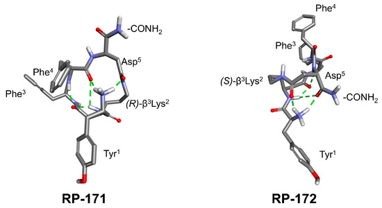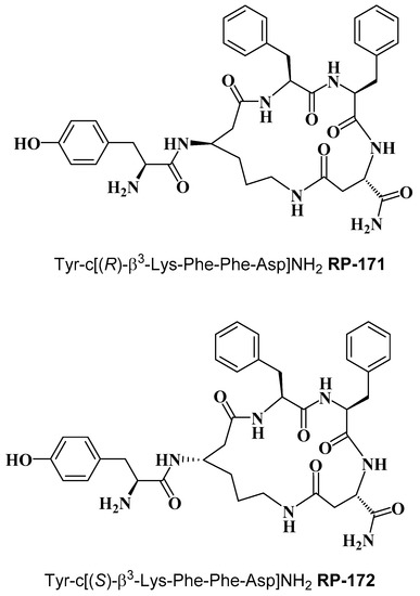 Cyclopeptides containing a β-amino acid, Tyr-c[(R)-β3-Lys-Phe-Phe-Asp]NH2 (RP-171) and Tyr-c[(S)-β3-Lys-Phe-Phe-Asp]NH2 (RP-172) (Figure 1) were synthesized on the solid support, using Fmoc/t-Bu strategy, with the hyper-acid labile groups (Mtt and O-2-PhiPr) for the selective protection of amine/carboxyl side chains of (R)- and (S)-β3-Lys and Asp, engaged in cyclization. After deprotection of the functionalized side chains, the linear sequences were cyclized through amide bond formation. Final products were obtained with a purity greater than 95%, as assessed by semi-preparative RP-HPLC. The detailed analytical data of the synthesized peptides are provided in the Supplementary Materials (Table S1, Figures S2 and S3).