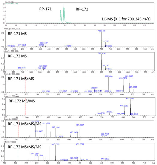 LC-MSn analysis of peptides RP-171 and RP-172. Extracted ion chromatogram (XIC) showing two peaks for the mixture of peptides (top panel): MS panels, all spectra recorded for the retention time of indicated peaks; MS spectra, MS/MS spectra for the precursor ions m/z 700.34, and MS/MS/MS spectra for the precursor ions m/z 586.30.