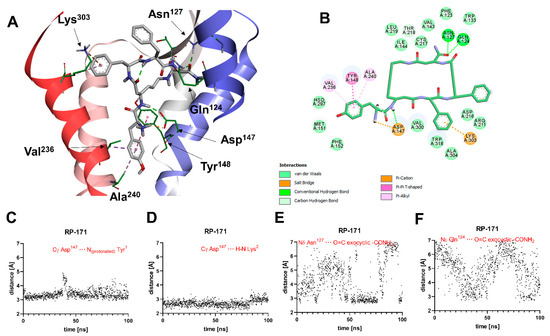 A general view of the binding pose of RP-171, as found in the MD simulations at t = 100.0 ns, is shown in Figure 4A. The interaction scheme is presented in Figure 4B. The compound is anchored in the MOR binding site first and foremost by the canonical interaction of the protonated amino group of Tyr1 with Asp147. Additionally, the amide hydrogen of the peptide bond joining Tyr1 and β3-Lys2 interacts with Asp147. These two interactions are stable throughout the simulation (Figure 4C,D). Other polar contacts stabilizing the complex are hydrogen bonds between the exocyclic carbonyl oxygen and Gln124 or Asn127, but these interactions fluctuate in the simulation time (Figure 4E,F). The remaining contacts are of apolar character. The aromatic ring of Tyr1 is involved with π-π stacking with Tyr148 and π-alkyl interactions with Ala240 and Val236 side chains. Other residues in the close vicinity of this aromatic ring are Met151 and His297. The aromatic ring of the Phe3 residue approaches Trp318, Lys303, and Ala304, while the Phe4 aromatic ring is exposed to the solvent close to the extracellular outlet of the binding site. For other residues participating in van der Waals contacts, refer to Figure 4B.