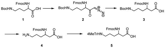 (R)- and (S)-Fmoc-β3-Lys (Mtt), which are not available commercially, were obtained by homologation of D- and L-Orn, respectively, according to the general procedure [19]. The synthetic protocol is outlined in Scheme 1.