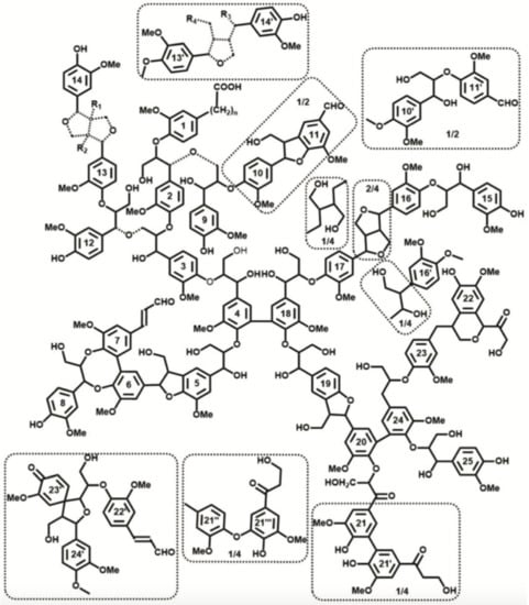 Tentative structural model of spruce milled wood lignin (MWL). Reproduced with permission from [63].