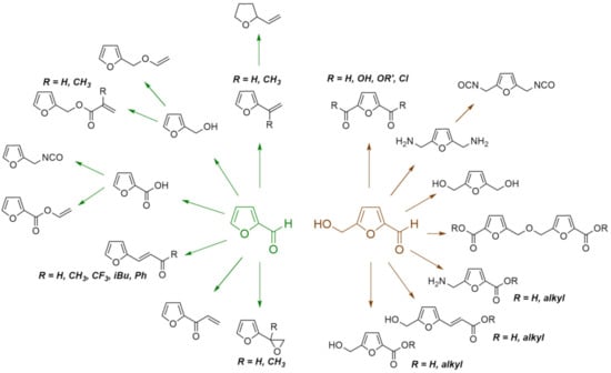 Two main strategies are possible to produce polymers from furan-based building blocks, viz., the synthesis of monomers that are suitable for chain (co)polymerizations, forming macromolecules with pendant furan moieties, and of those that are suitable for step-growth polymerizations, which produce macromolecules with the furan heterocycle within their backbone [6]. The former strategy is mostly based on F, which is an important platform for the synthesis of unsaturated furans (Figure 6, left part), whose susceptibility to polymerize via chain reactions depends on their specific structure, and on their actual response to different types of initiation. The latter strategy, on the other hand, relies on the possibility of converting 5-hydroxymethylfurfural into bifunctional building blocks (Figure 6, right part), which opens the way for the preparation of polyesters, polyamides, polyurethanes, and other polycondensates that have been synthesized from petrochemical precursors since the beginning of last century but derived instead from precursors which are based on vegetable renewable resources. It is important to emphasize that the range of possibilities is not limited to the structures presented in Figure 6, and efficient routes for novel derivatives are constantly being reported. This is the case of furandiacylazide, from which the corresponding furanic diisocyanate can be obtained with yields up to 99% [126], and bisfurfural, that may serve as a platform for original monomers and polymers [127].