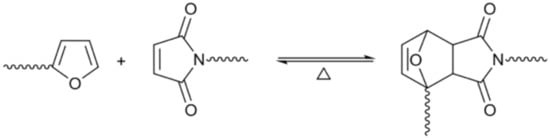 - Gandini, A. The furan/maleimide Diels-Alder reaction: A versatile clink-unclick tool in macromolecular synthesis. Prog. Polym. Sci. 2013, 38, 1–29. [Google Scholar] [CrossRef]