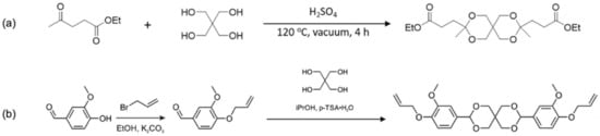 (a) Ketalization of levulinic acid and pentaerythritol for the synthesis of a cyclic polycondensation monomer [168]. (b) Synthesis of a bio-based allyl ether monomer from vanillin [167].