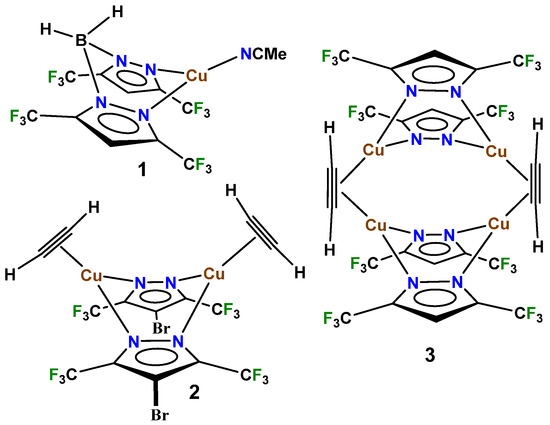 | Cu2(μ-[3,5-(CF3)2Pz])2(HC≡CH)2 10 | Cu2(μ-[3,5-(CF3)2Pz])2(EtC≡CEt)2 7 | Cu2(μ-[3,5-(CF3)2Pz])2(PhC≡CH)2 9 | Cu2(μ-[4-Br-3,5-(CF3)2Pz])2(HC≡CH)2 2 | |||||||