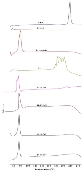 DSC thermal studies were performed to investigate the compatibility of drug and excipients (PLGA, tristearin, and SL). The DSC spectra of BTB, PLGA, tristearin, SL and their B-PLNs (B-PLN1-B-PLN4) are presented in Figure 1. The DSC spectra of pure BTB drug exhibited a sharp endothermic peak at 217.97 °C, which confirmed the purity and crystallinity of the drug [31]. PLGA showed a glass transition temperature at 58 °C. The DSC spectrum of tristearin exhibited a distinct endothermic peak at 79 °C, whereas SL showed a merge of multiple peaks between temperatures 180 to 205 °C [42,43]. The endothermic peak of pure BTB were absent in all B-PLNs (B-PLN1-B-PLN4), which clearly indicated successful encapsulation of the drug [44]. The peak associated with tristearin could be seen in all formulations, due to the covering of lipid on the polymeric core.